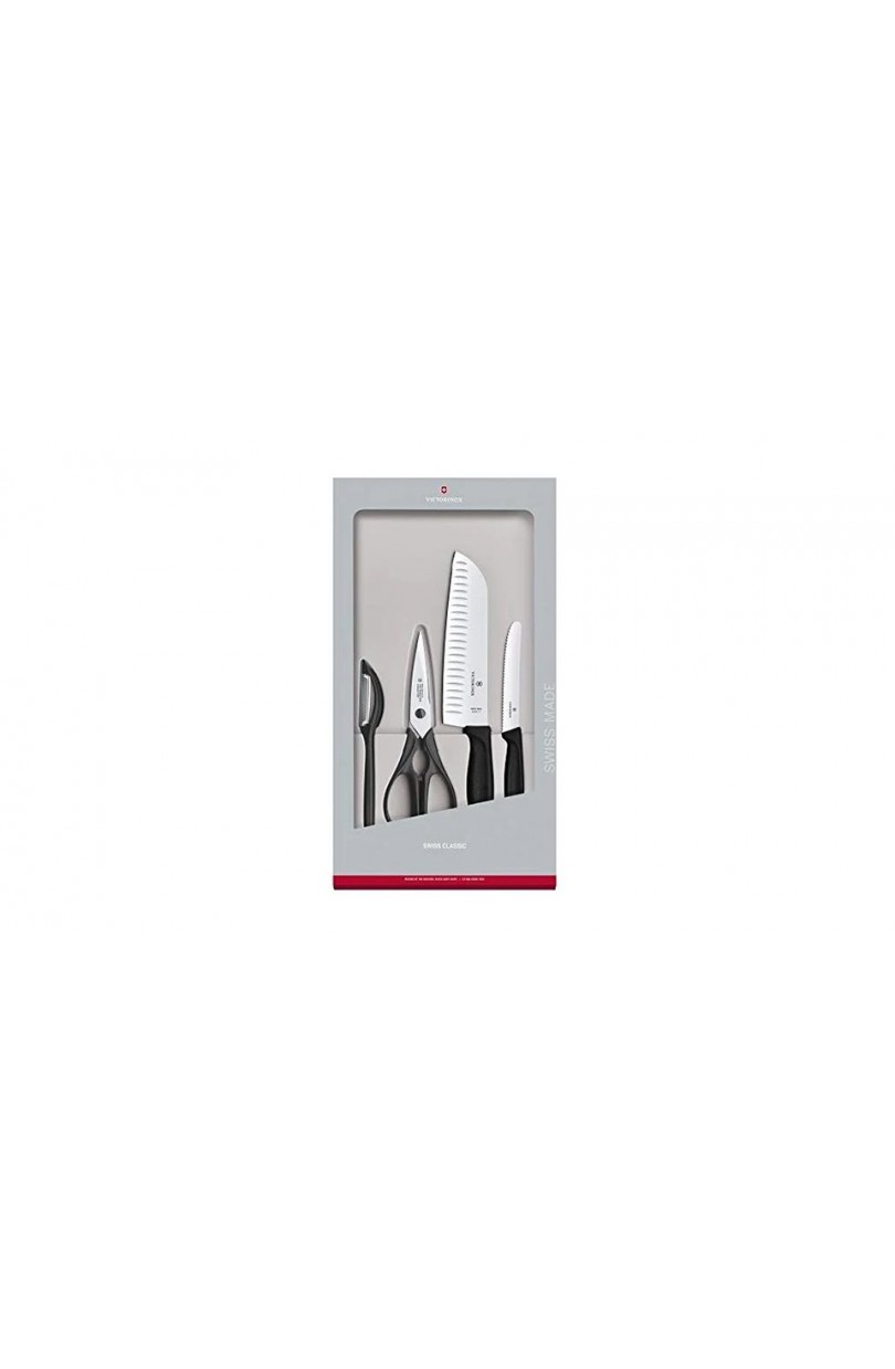 Set da 4 pz. con accessori cucina, Swiss Classic con manico rosso in comoda ed elegante confezione regalo, che contiene: - V-7.6363 Forbici da cucina - V-7.6075.1 Pelaverdure - V-6.7831 Coltello tavola seghettato 11 cm - V-6.8521.17G Santoku alveolato 17 cm.