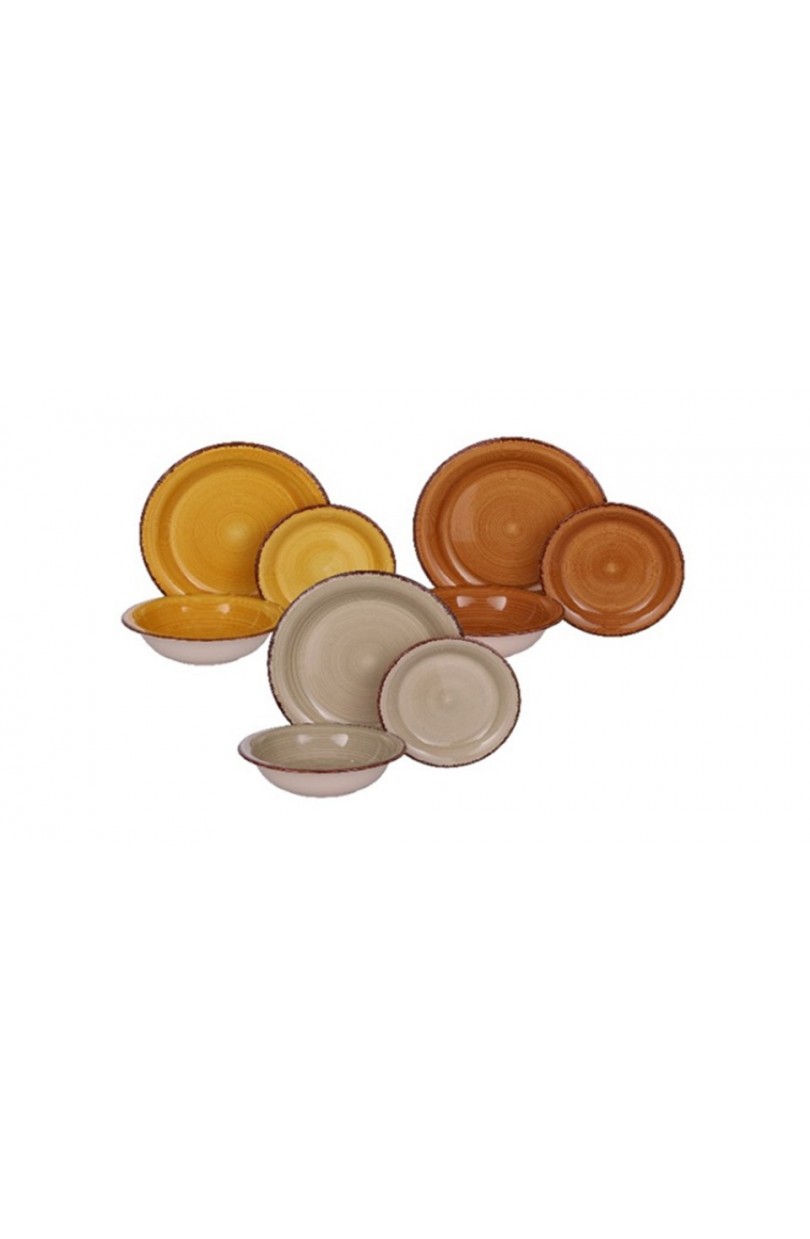Set Tavola per 6 persone, composto da 18 pezzi: 6 PIATTI PIANI CM 27 6 PIATTI FONDI CM 22 6 PIATTI FRUTTA CM 19 Il servizio in Stoneware" Elements" molto durevole e pratico, rappresenta una scelta elegante e si adatta ad ogni tipo di tavola e d'ambiente. N.B. : IN COLORI ASSORTITI .