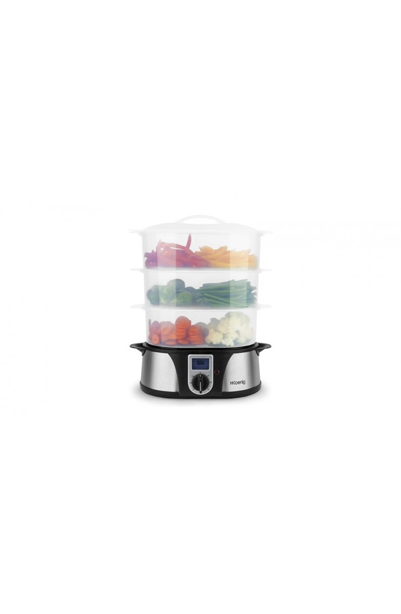 Vaporiera con 3 contenitori trasparenti e removibili per cuocere al vapore, e in salute, i diversi alimenti.